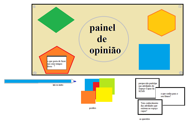 O painel de opinião será feito em formato de "individual de refeição", de forma a ser fácil de aplicar em qualquer contexto incluíndo em cafés. Precisaremos de uma folha A4 onde está escrito painel de opinião, canetas, postites e umas palavras que devemos introduzir no painel para questionar as pessoas. Este painel deve ser introduzido como um jogo, inicialmente devemos introduzir o tema, " queremos fazer-lhe algumas questões para ficarmos a saber a sua opinião sobre alguns assuntos" se a pessoa se mostrar disponível, explicamos as "regras do jogo". Dizendo algo como " gostava que participasse neste painel de opinião, não existem respostas certas nem erradas terá só de dar a sua opinião sincera, funcionará eu digo uma palavra ( ponho a palavra no painel) e só tem de escrever nestes papelinhos o que pensa a respeito, se não quiser escrever, pode ditar que eu escrevo"